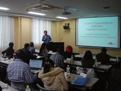 そのような感染症対策に関連する本研修は、1987 年より開始され、これまで東京を中心に実施されてきましたが、今年度からは東京に加えて、長崎の感染症対策の経験や県保健行政の実施体制、そして長崎大学が有する熱帯医学研究所等における最先端の知見を学ぶべく、研修プログラムを一新して実施することになりました。今年は、エチオピア、ケニア、タジキスタン、中国、パキスタン、パナマ、マリ から合計14 名が参加して、長崎では2 月24 日(月) から3 月3 日(月)まで研修が行われました。
