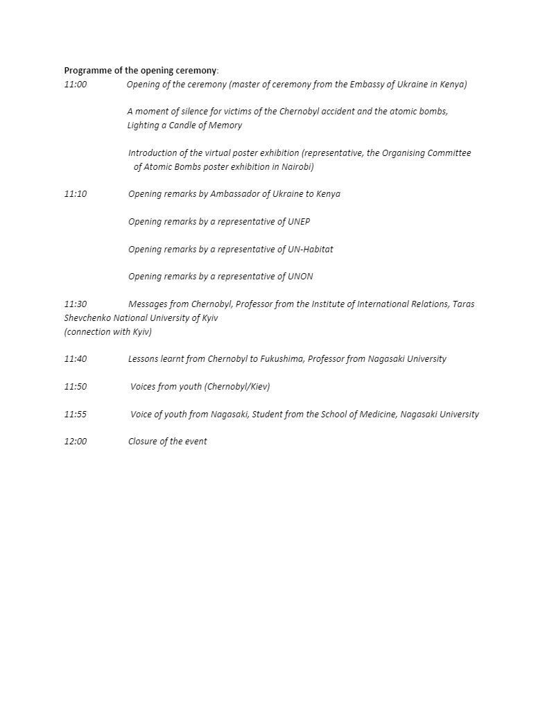 2021年5月27日2022年8月17日お知らせ、研究教育活動 チェルノブイリ・広島・長崎原爆オンラインポスター展 ~若い世代へのメッセージ~ 開催のご案内 チェルノブイリ原子力発電所の事故から35年の今年、ケニアのウクライナ大使館や国連など国際機関が集まり、4月26日から5月31日まで、ウェブサイトにおいて「チェルノブイリ・広島・長崎原爆オンラインポスター展~若い世代へのメッセージ~」が開催されます。 ポスター展にはこちらからアクセスできます。 長崎大学名誉教授も登壇する予定です。(終了しました)