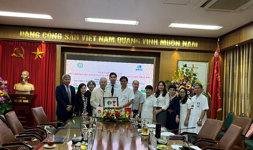さらに同日、バクマイ病院を訪問し、院長のDao Xuan Co准教授及び河野学長が学術交流協定の更新に関する合意書に署名を行いました。同病院との間では、感染症の共同研究が行われているほか、熱帯医学・グローバルヘルス研究科学生の臨床実習等に協力いただくなど、人材育成面での連携も行われてきました。今後もバクマイ病院の医師が長崎大学で学ぶ機会を増やすことや、国内外の機関間のネットワークを強化することについても意見交換が行われました。